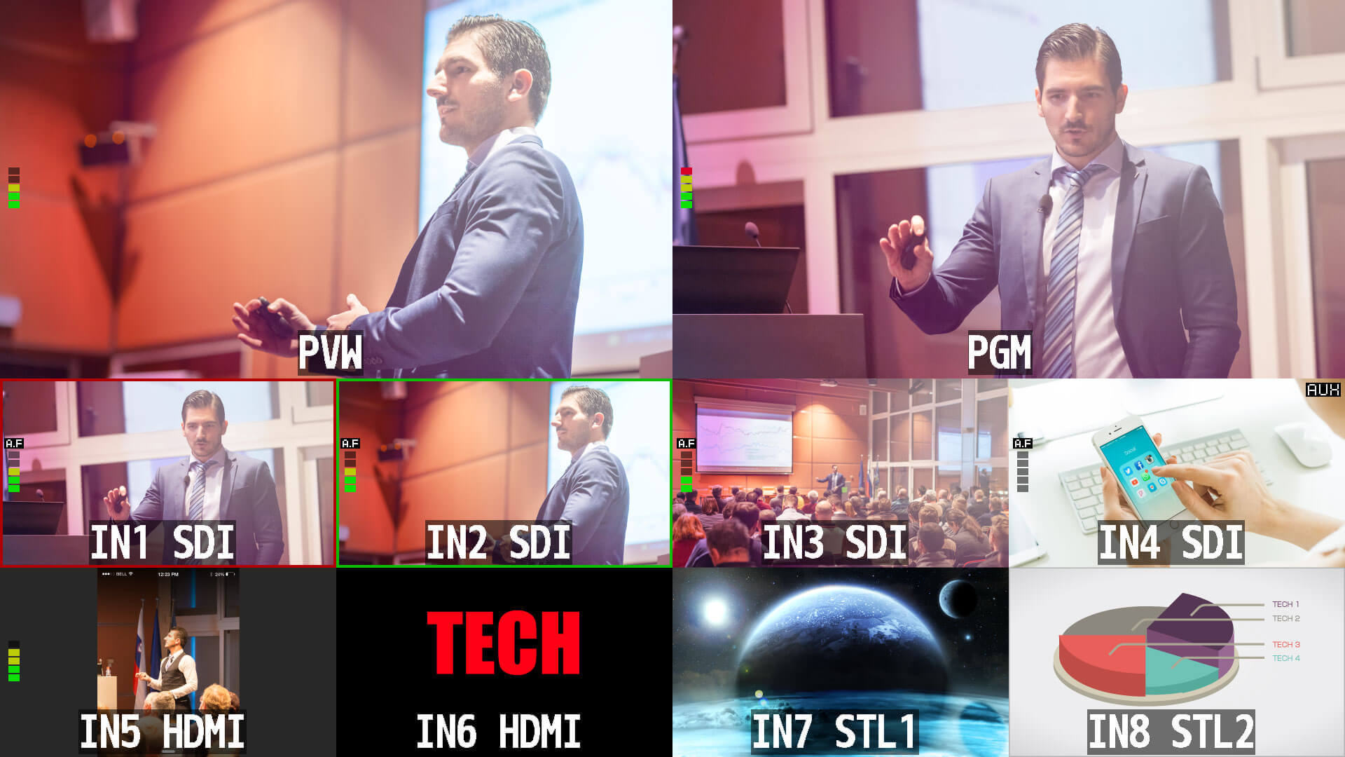 - Четыре входа SDI и два входа HDMI идеально подходят для одновременного переключения камер и компьютеров для динамичных презентаций;
