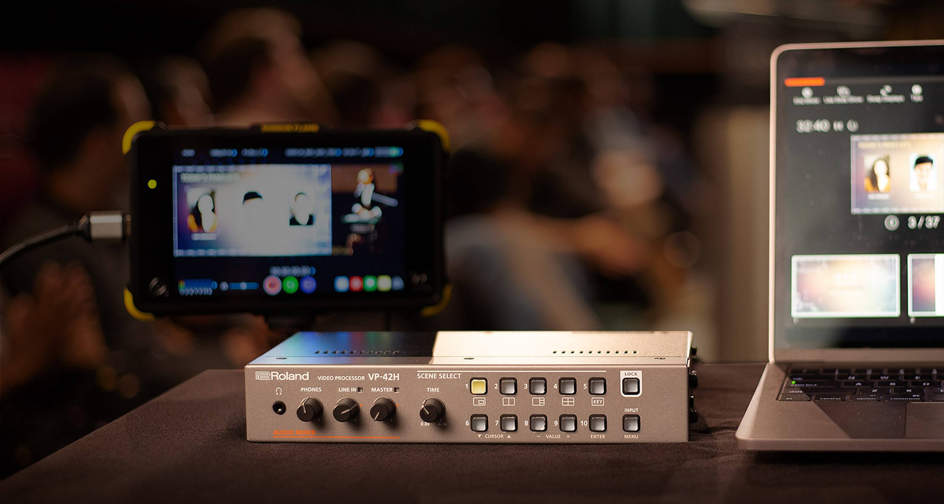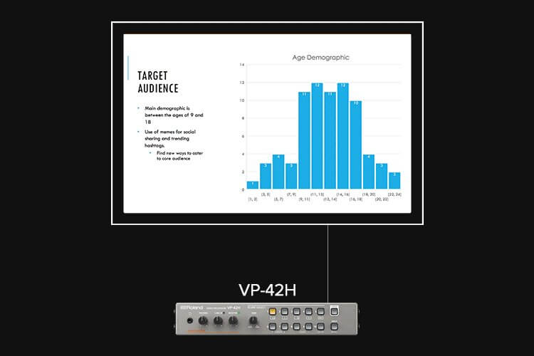 Roland VP-42H включает стерео выходы RCA для деэмбедирования звука с подключенных источников HDMI и вывода его на другие устройства, такие как динамики и микшеры. Уровни для каждого источника могут быть установлены внутренним аудиомикшером, и если VP-42H используется в качестве композитора для записи или потоковой передачи, звук с внешнего микшера или других источников можно подключить к входам RCA и встроить в Выходной сигнал HDMI.
