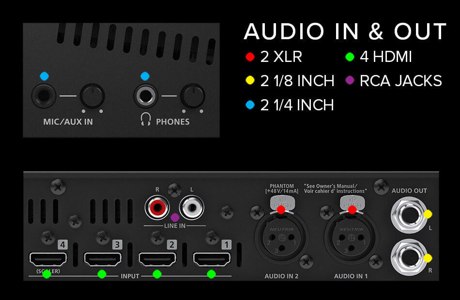 Благодаря двум микрофонным входам XLR и выбираемому фантомному питанию V-1HD + позволяет вам использовать профессиональные микрофоны в своей работе, включая конденсаторные микрофоны для вещания. Также есть 1/8-дюймовый вход для петличного микрофона или стерео источника звука, такого как смартфон, плюс еще один стерео вход на разъемах RCA. Встроенный стереозвук с четырех входов HDMI также может быть включен в ваш микс.