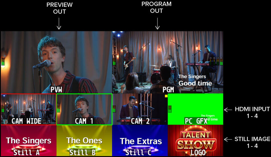 10-оконный мультиэкранный дисплей может быть применен к одному или обоим выходам HDMI, помогая вам управлять производством в реальном времени. Готовьте снимки с камеры, просматривайте презентации и выбирайте сохраненные неподвижные изображения, прежде чем передавать их в прямом эфире в канал программы. Также можно отслеживать статус записи видеокамеры.