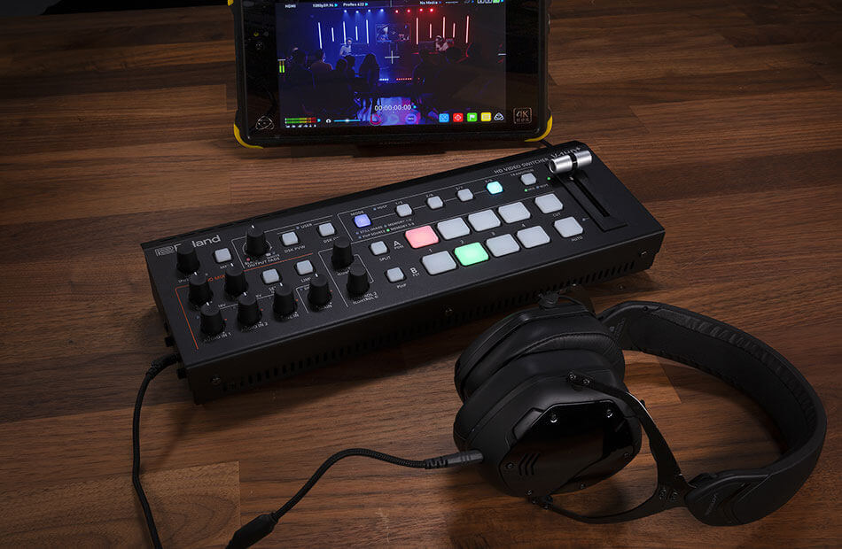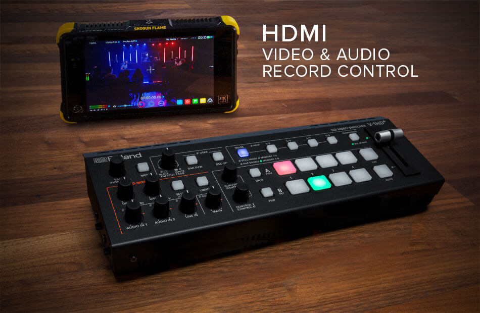 С V-1HD + нет необходимости в специальной небольшой аудиоконсоли. Распространяйте аналоговый звук на систему PA через два сбалансированных TR-дюймовых TRS-выхода и используйте эмбедированный цифровой звук на выходах HDMI для подачи на рекордеры и прямых трансляций.
