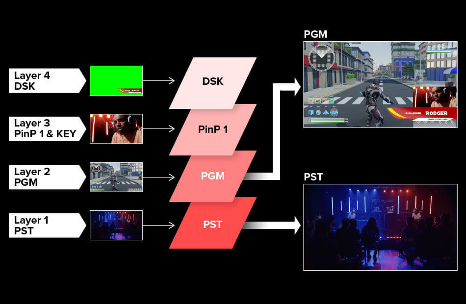 Слой DSK (нисходящий кейер) позволяет независимо составлять окно «картинка в картинке» (PinP) на видеопотоке, что особенно полезно для гибридных событий в реальном времени и онлайн. Например, при отображении экранной графики для живой презентации вы также можете наложить снимок с камеры выступающего на сцене, который видна только онлайн-аудитории.