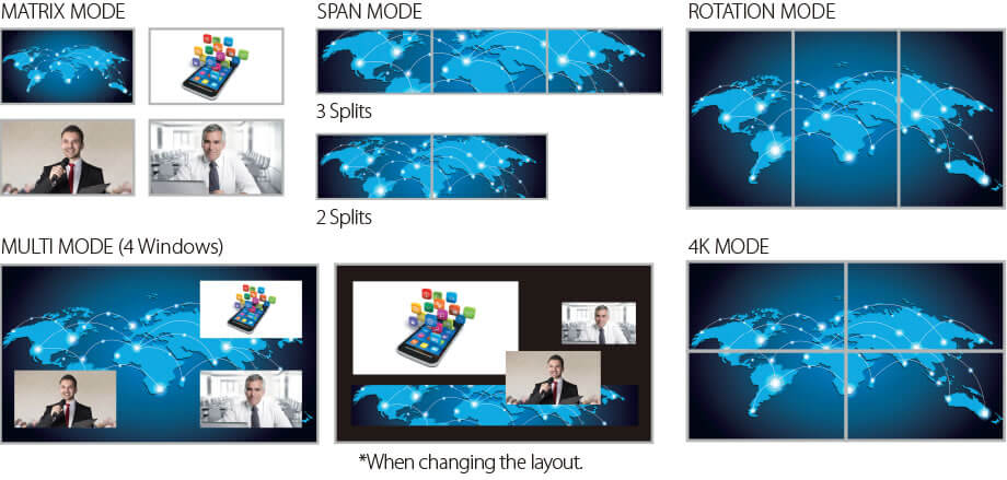 Эта серия оснащена видеопроцессором, который позволяет комбинировать видеосигнал и разделенное изображение в большом количестве постановок. Переход с растворением возможен в версии 2.0. * Формат вывода нельзя изменить отдельно при использовании функции композиции.