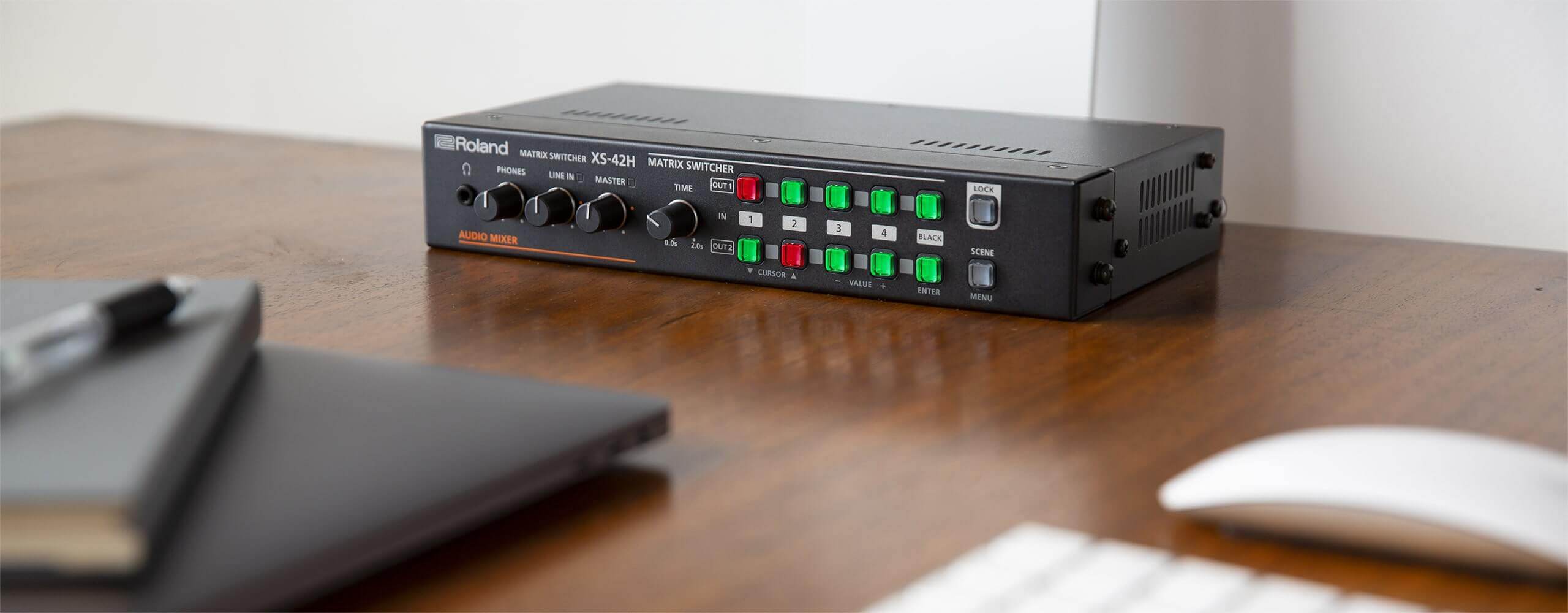 Хотя большинство телевизионных светодиодных и ЖК-панелей выглядят хорошо, о звуке часто думают в последнюю очередь. Roland XS-42H включает стерео выходы RCA для подключения к внешним динамикам или звуковым панелям, что обеспечивает исключительно высокое качество звука. Внутренний аудиомикшер XS-42H будет переключать звук в соответствии с видеовходом, используя звук, встроенный в сигнал HDMI компьютера - дополнительных аудиокабелей не требуется.
