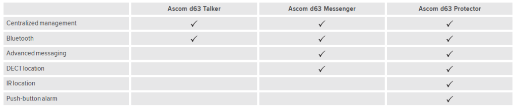 Помимо превосходной телефонии, его расширенные возможности обмена сообщениями делают его идеальным для взаимодействия с коллегами и даже автоматизированным оборудованием. Ascom d63 доступен в ряде моделей функциональности, зависящих от лицензии, — от надежной трубки только для телефонии (Talker) до той, которая также поддерживает профессиональный обмен сообщениями (Messenger) и до расширенной модели, которая включает возможности персональной сигнализации и инфракрасного определения местоположения (Protector)