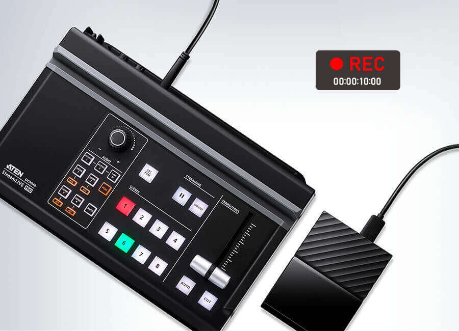 AV-микшер StreamLIVE, создан для прямой трансляции и VoD (видео по запросу), поддерживает прямую программную запись и непосредственное сохранение на подключенный через USB-порт внешний жесткий диск. Записывайте невероятные видеоролики в формате FHD и кодированием H.264, которые идеально подходят для любого рабочего процесса производства и пост-обработки и могут быть мгновенно обработаны самыми популярными программными пакетами. Создавайте материалы и делитесь с теми, кто не смог посмотреть их в прямом эфире. Создайте библиотеку видео по запросу или используйте совместно с любой системой управления видеоматериалами.