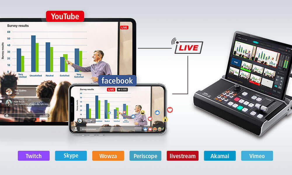 Благодаря встроенному аппаратному кодировщику и серверу потоковой передачи AV-микшер StreamLIVE PRO может практически в любом месте, через соединение Ethernet вести прямую трансляцию одновременно на две платформы, включая Facebook, YouTube, Vimeo, Livestream или любую другую определяемую пользователем, поддерживающую протокол RTMP, при этом в стабильном высоком качестве уровня Full HD. Он также может освободить Ваш компьютер для наблюдения за трансляцией и взаимодействия с аудиторией, избавляя Вас от приобретения дорогостоящего мощного компьютера для кодирования видео.
