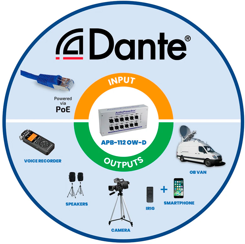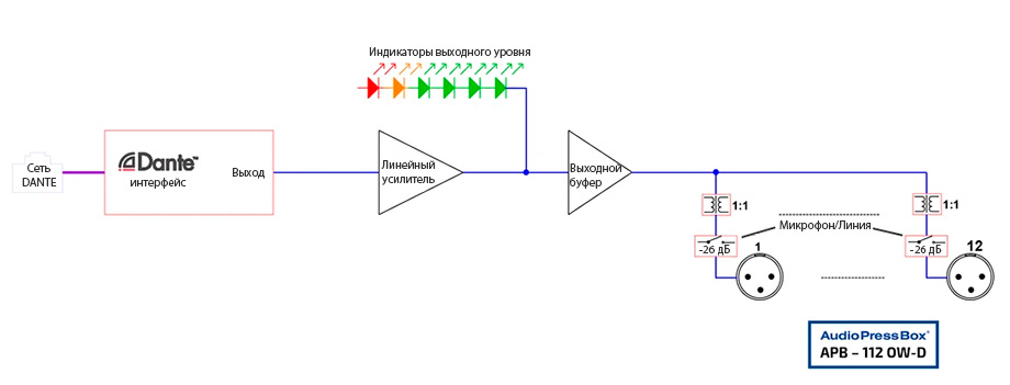 Передовые технологии подключения. Важнейшей особенностью модели является полная интеграция в современные аудиосети на базе протокола Dante. Это обеспечивает простоту настройки и масштабируемость системы: вы можете легко расширять количество выходов, добавляя дополнительные блоки APB-112 OW-D в сеть по единому кабелю Ethernet. Питание устройства осуществляется по технологии PoE (Power over Ethernet), что значительно упрощает монтаж, исключая необходимость подвода отдельных электрических кабелей к месту установки.