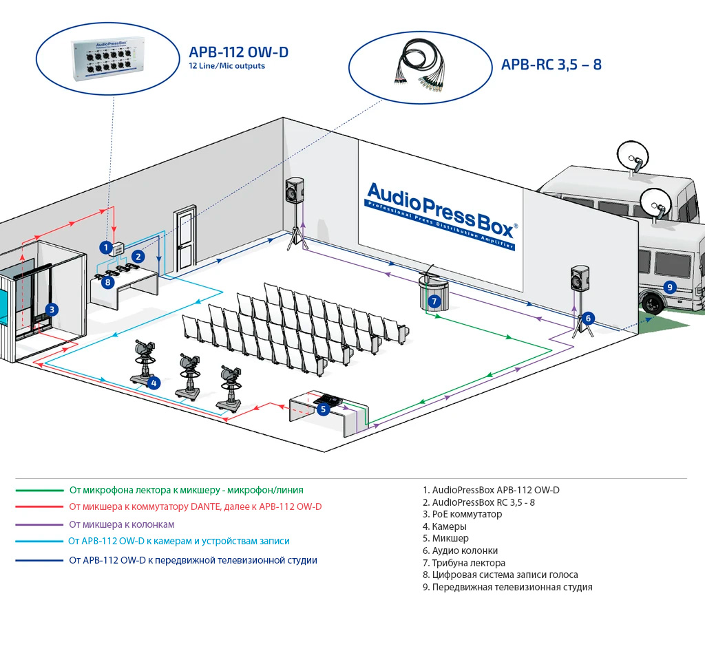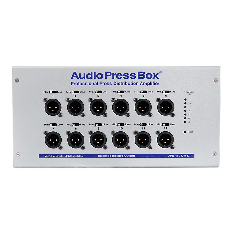 Профессиональное решение для распределения аудио. AudioPressBox APB-112 OW-D представляет собой специализированный активный блок, разработанный для высококачественной передачи и распределения аудиосигнала в инсталляционных системах. Устройство идеально подходит для пресс-центров, конференц-залов и других объектов, где требуется надежная трансляция звука на несколько точек приема одновременно.