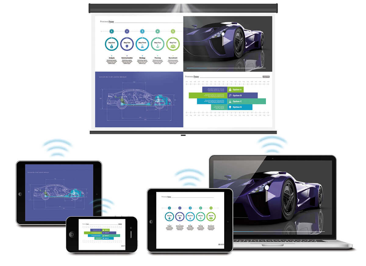 Беспроводное решение InstaShow™ позволяет мгновенно начать презентацию. Без установки ПО, дополнительных драйверов, настроек и проверки совместимости. InstaShow™ позволяет сразу 32 докладчикам с комфортом вести свои презентации без потерь времени на подготовку и ожидание. Совместная работа проходит намного быстрее. Кроме того, производительность системы InstaShow™ не зависит от компьютерного процессора. Кодирование, защита и декодирование информации производится автоматически
