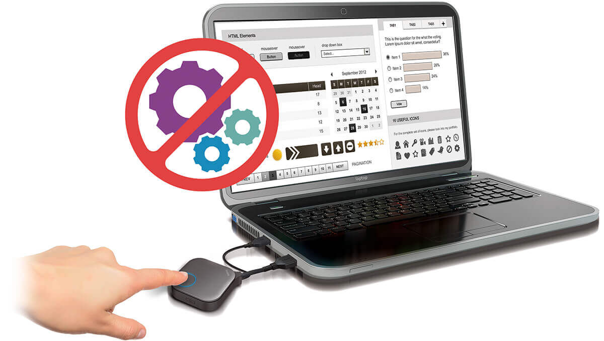 Чтобы начать работать с InstaShow™, достаточно просто подключить модуль с кнопкой к источнику изображения, например, к ноутбуку. Нет никакого ПО, которое нужно устанавливать, настраивать или запускать дополнительно. Благодаря этому в презентации будет меньше остановок и меньше сопровождающего их неловкого молчания — всё начинается мгновенно.