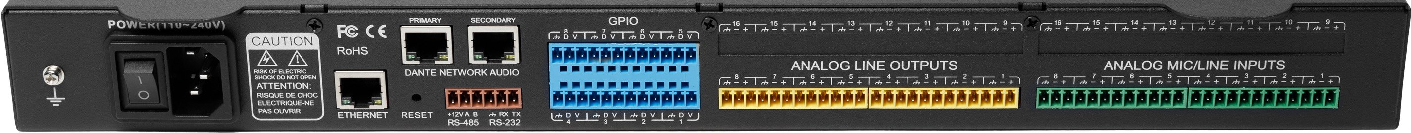 - Разъем Dante Secondary, используемый для подключения аудиопроцессоров в цепь