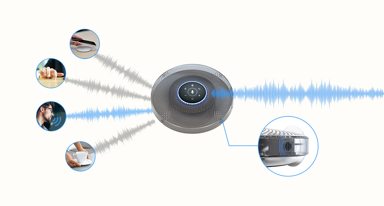 Спикерфон SP40 оснащен интеллектуальным алгоритмом VoiceIA, который позволяет эффективно бороться с фоновыми шумами и эхо, такими как шум кондиционера, звуки работы на клавиатуре, перемещения кресел и другие звуки рабочего окружения.