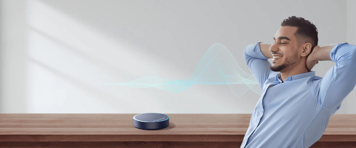 Встроенный 45 миллиметровый динамик оснащен функцией автоматического переключения между режимом конференции для кристально чистого человеческого голоса и музыкальным режимом для воспроизведения музыки с высокой точностью.