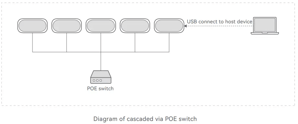 - Компьютер подключается к одному из спикерфонов через USB, подключенный спикерфон становится “главным устройством” (Master), а другие каскадированные спикерфоны становятся “подчиненными” (Slave).