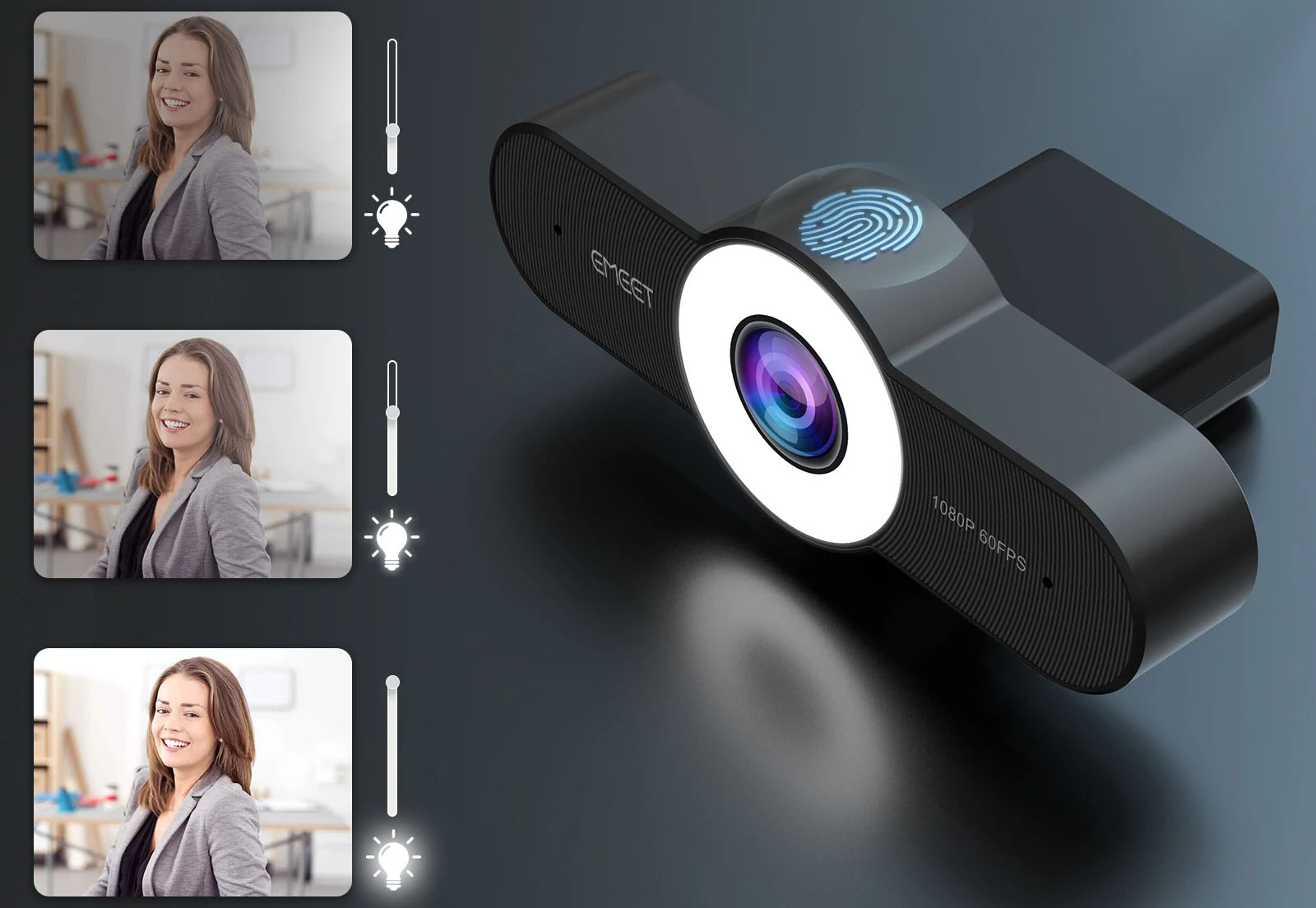 Встроенная в веб-камеру кольцевая лампа позволит осветить вас даже при выключенном внешнем свете комнаты. Лампа имеет 3 уровня регулировки яркости.