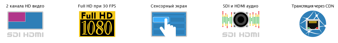 - Работа с сигналом: До 2-х каналов 1080p видео при 30 fps одновременно с трёх источников Full HD видео.