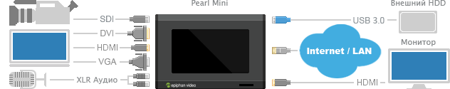 Pearl Mini имеет небольшие размеры и весит всего 1,7 кг, что позволяет использовать его как эффективную мобильную платформу для захвата, записи, трансляции и видеомонтажа в реальном времени.