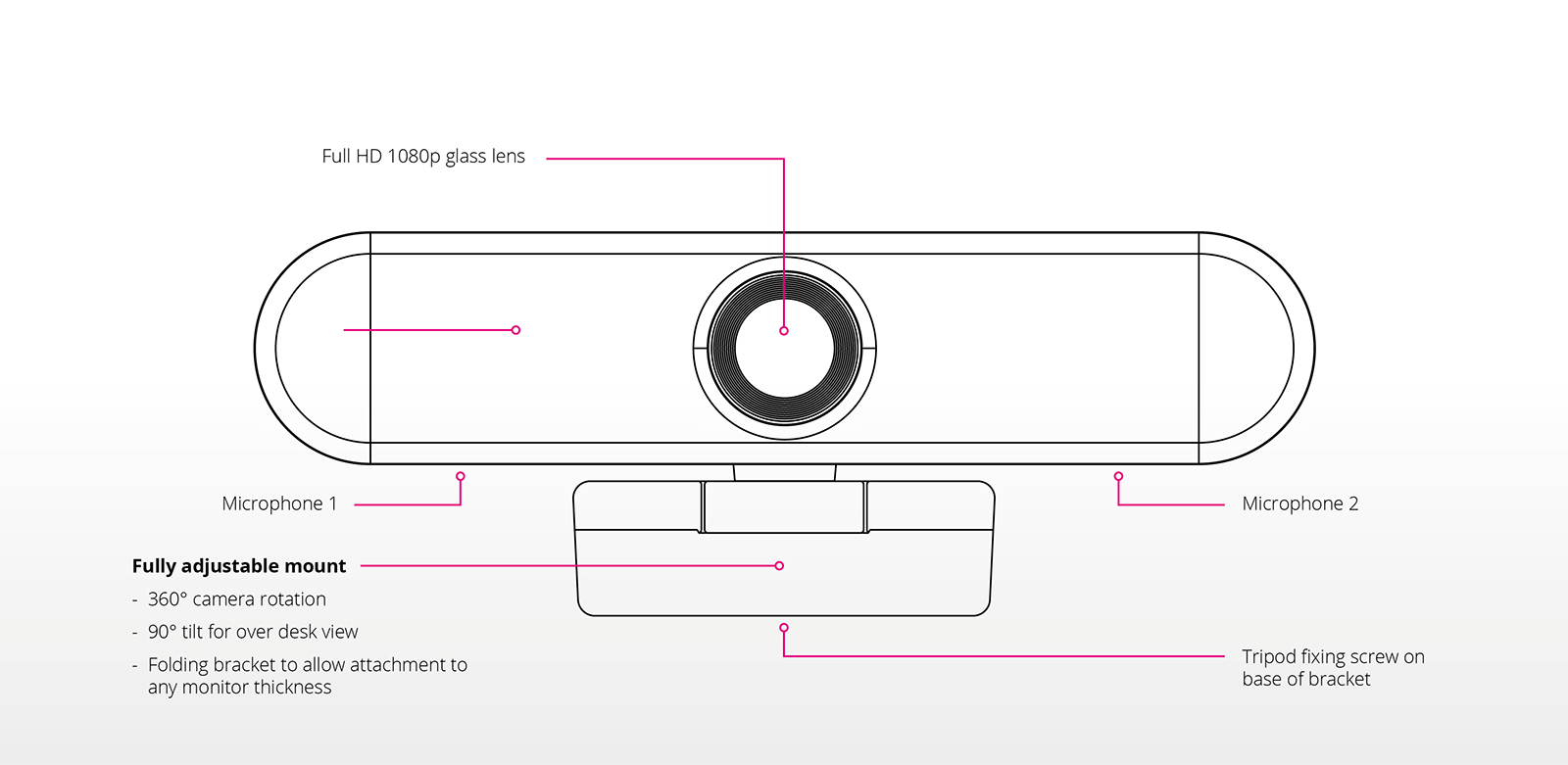 С шарнирным кронштейном, чтобы его можно было разместить над компьютером, чтобы проводить встречи лицом к лицу на большом расстоянии из конференц-зала или собственного домашнего офиса.