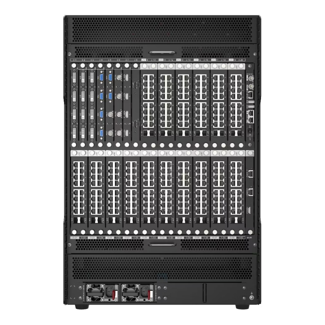 - Модульная архитектура: Поддержка до 30 входных и до 16 выходных карт обеспечивает создание конфигураций практически для любых задач, включая сложные видеостены.