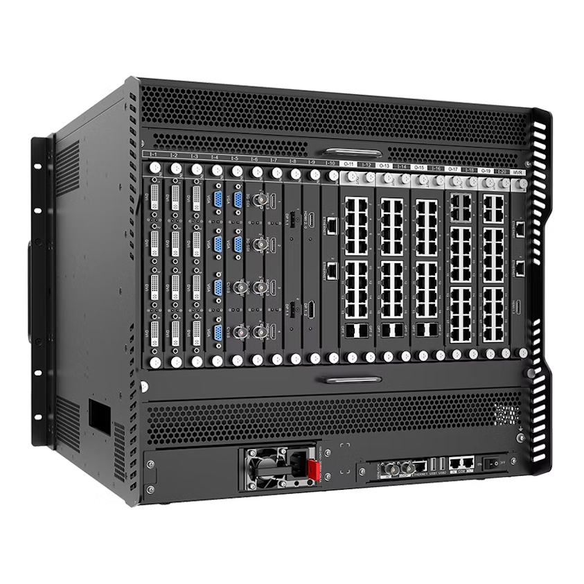 Гибкая архитектура и масштабируемость. Одной из ключевых особенностей модели является ее модульная структура, поддерживающая установку до 15 входных и 5 выходных карт. Это позволяет адаптировать контроллер под специфические требования заказчика. При оснащении соответствующими платами устройство способно обрабатывать и передавать сигнал с разрешением до 104 миллионов пикселей при использовании карт волоконно-оптической передачи, что делает его идеальным инструментом для организации впечатляющих видеостен.