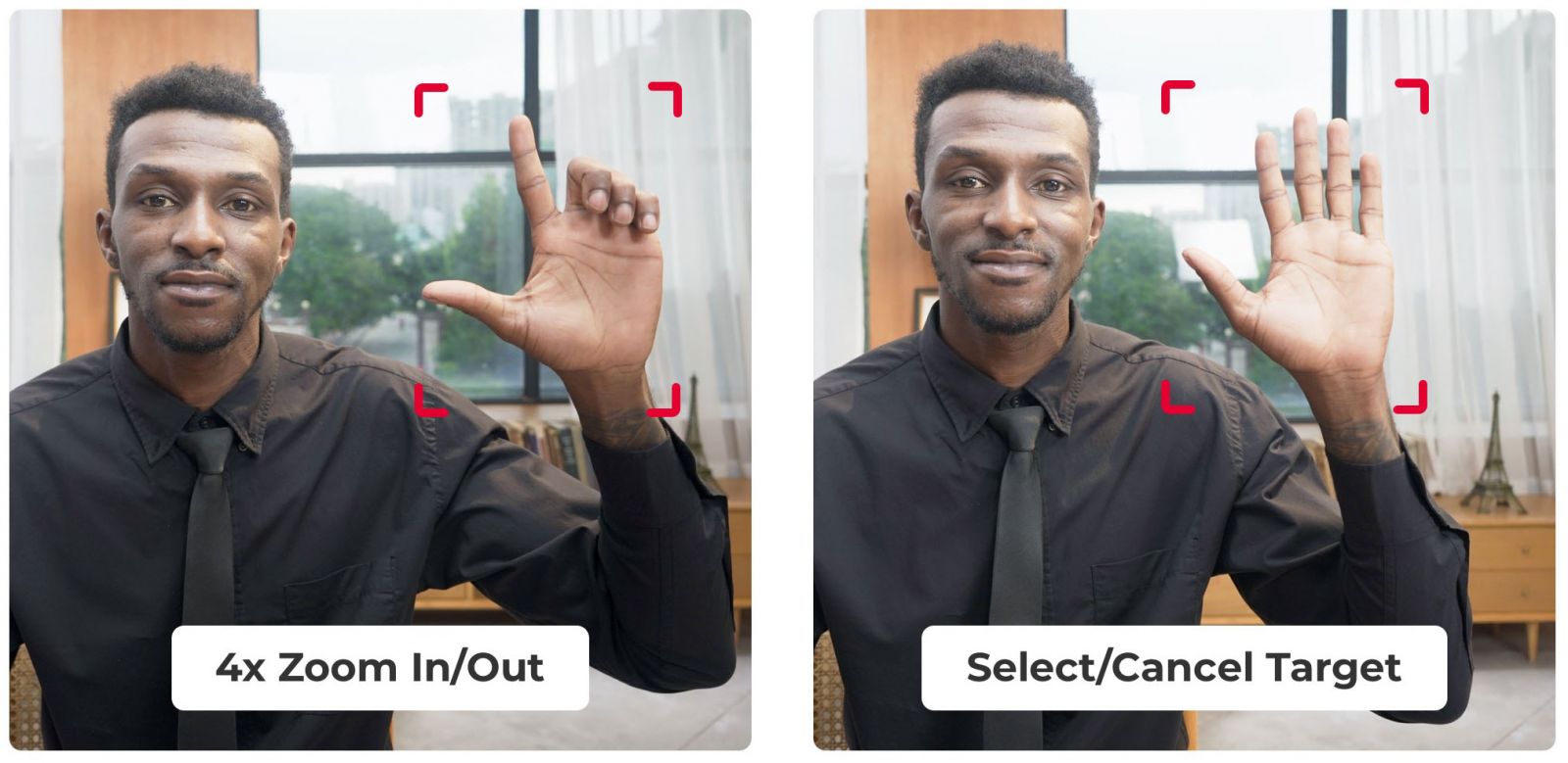 OBSBOT Tiny 4K позволяет получить доступ к ряду функций, таких как выбор/отмена цели отслеживания и увеличение/уменьшение масштаба с помощью простых жестов, без необходимости нажимать