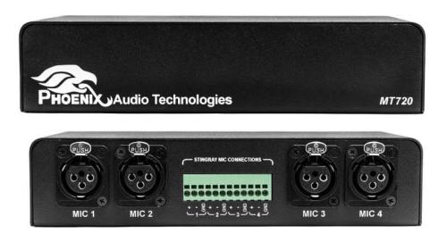 Конвертер XLR (MT720) необходим для подключения микрофонов с разъемом XLR к аудиомикшеру Phoenix Audio Stingray (MT700), который использует клеммные разъемы для подключения. Просто подключите XLR-микрофоны к разъемам XLR на задней панели MT720, а затем соедините клеммные разъемы от конвертера MT720 к микшеру Stingray. Phoenix Audio MT720 может быть размещен на любой поверхности, а также имеет дополнительные кронштейны, позволяющие устанавливать устройство на ТВ-стойку.