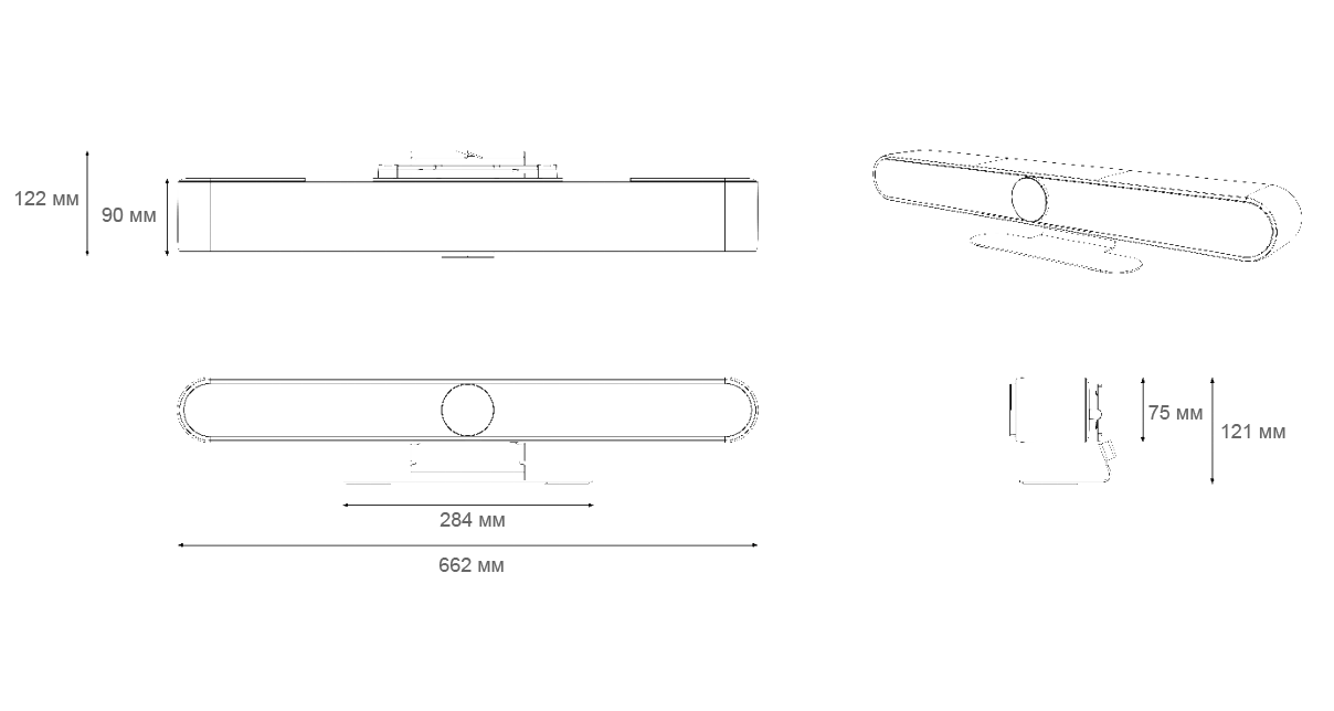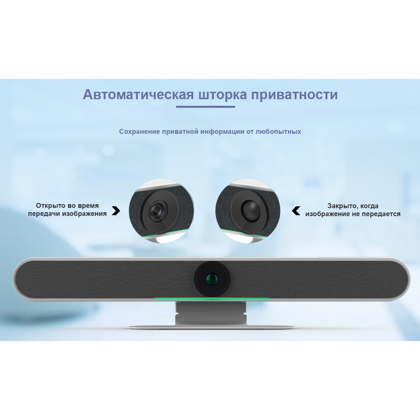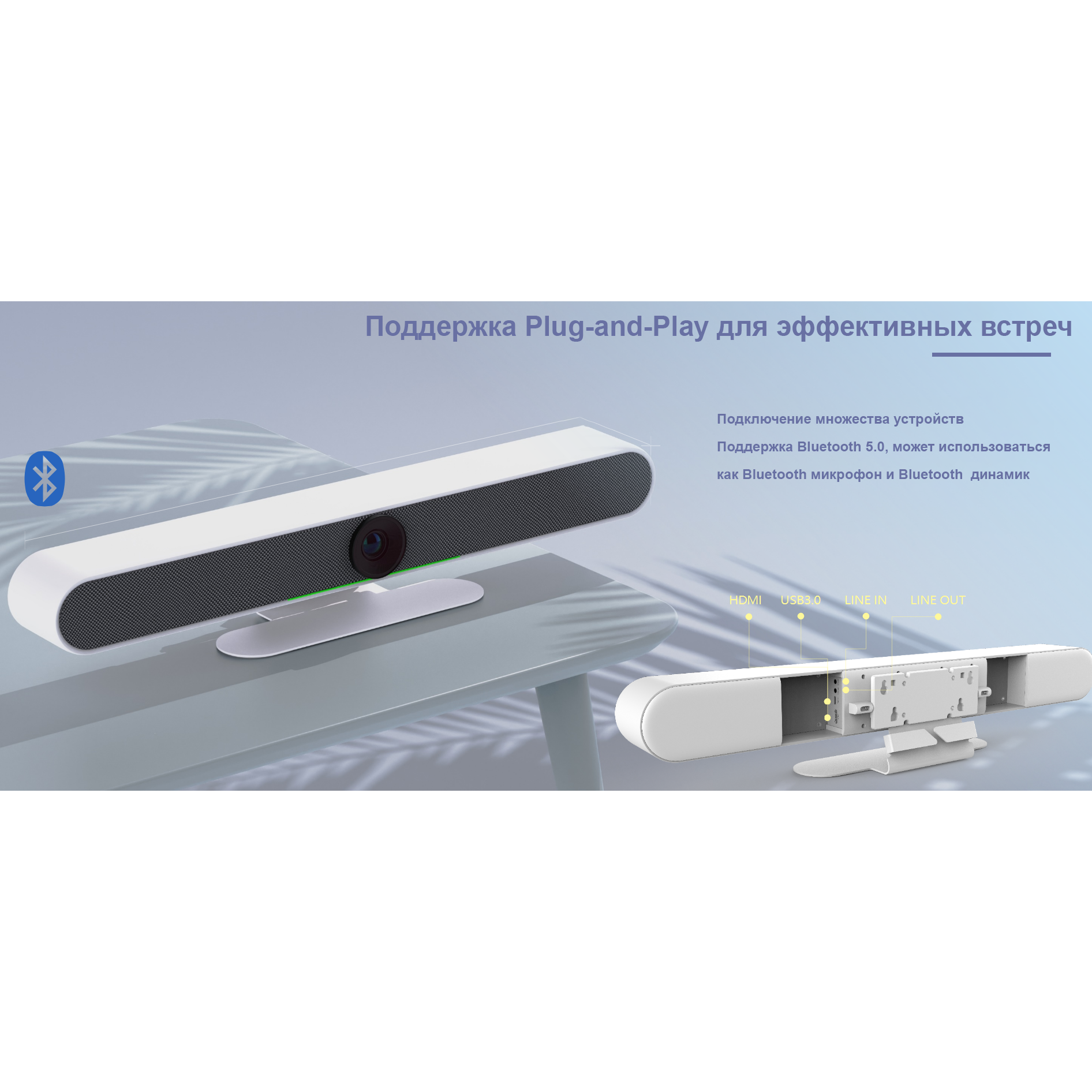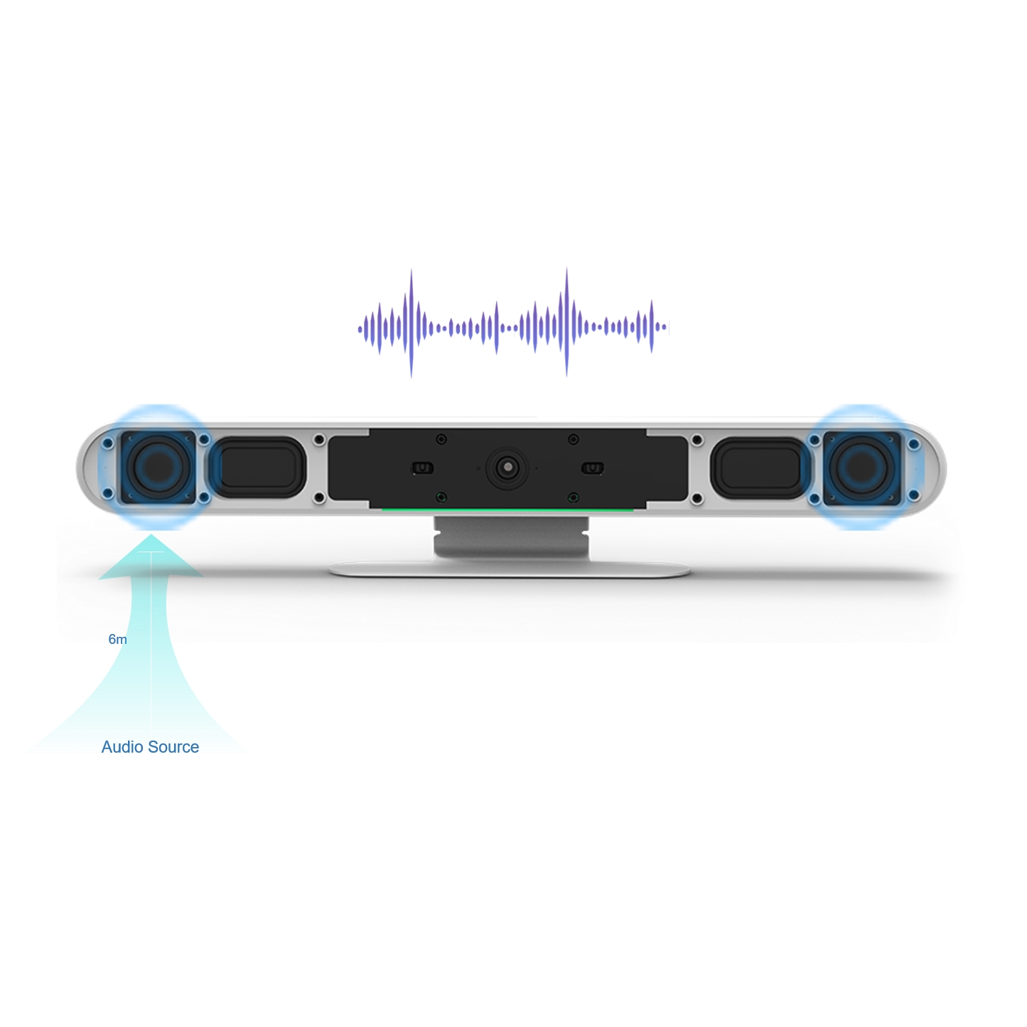 Устройство оснащено массивом из 6 микрофонов, способным захватывать голос на расстоянии до 6-8 метров. В сочетании с технологиями эхоподавления (AEC), автоматической регулировки усиления (AGC) и адаптивного шумоподавления (ANS), видеобар обеспечивает кристально чистую передачу речи. Два встроенных динамика мощностью 10 Вт каждый создают полноценное звуковое поле в помещении, делая общение максимально естественным.