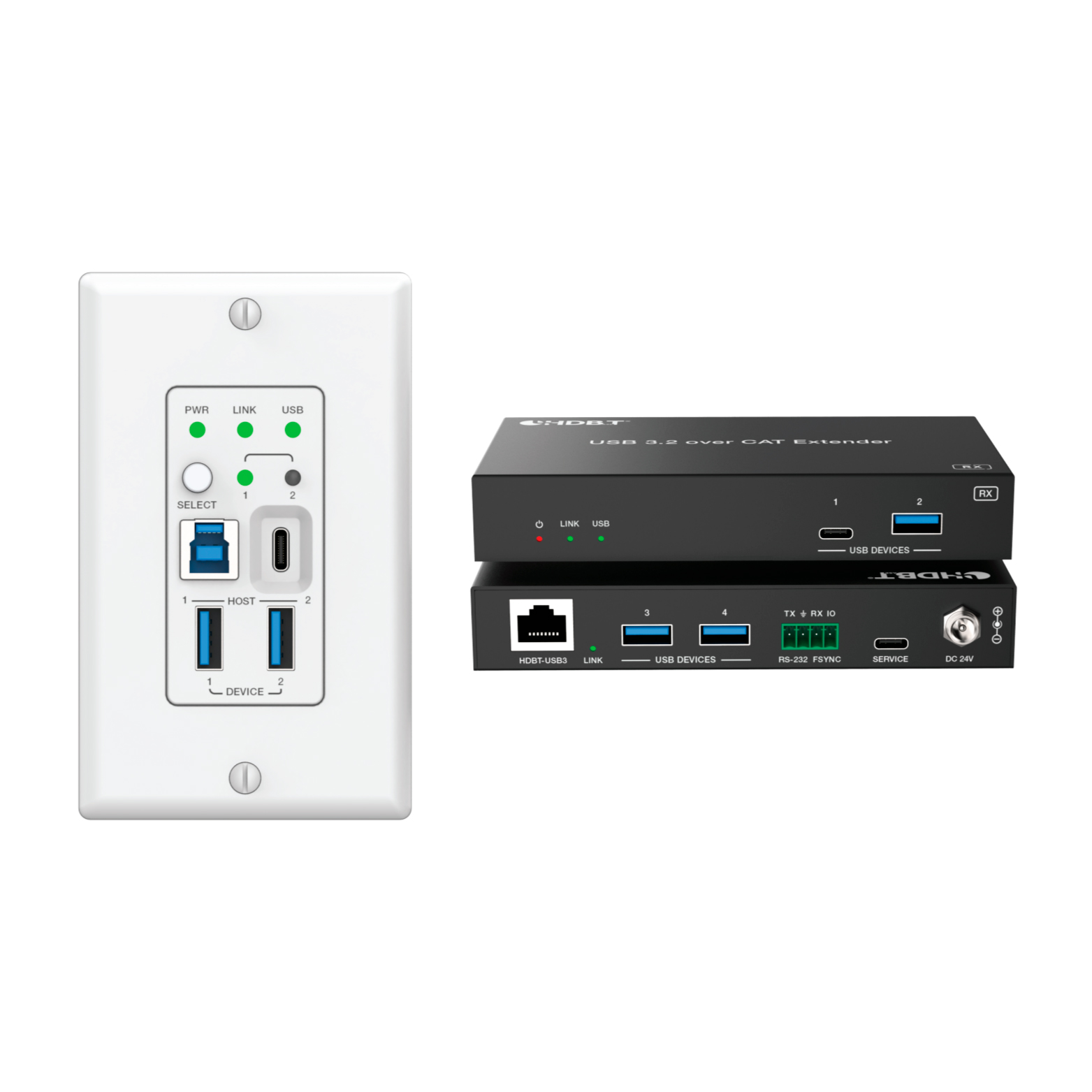 | Передатчик | Входы: 1× HOST 1 [USB Type C, 24-контактный, гнездо] 1× HOST 2 [USB Type B, 9-контактный, гнездо] Выходы: 2× USB-A DEVICE [USB Type A, 9-контактный, гнездо] 1× HDBT-USB3 [RJ45 разъем, 24 В PoC] Управление: 1× RS-232 [3-контактный разъем Phoenix 3.5 мм] 1× FSYNC [1-контактный разъем Phoenix 3.5 мм] 1× SERVICE [USB Type C, порт обновления прошивки] |
