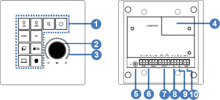 Гибкие возможности управления. Продуманная компоновка панели MFCP-10 включает 10 назначаемых пользователем кнопок и одну многофункциональную вращающуюся ручку со светодиодной индикацией, которая идеально подходит для точного регулирования громкости. Для подключения периферии предусмотрены два двусторонних последовательных порта RS-232, один программируемый ИК-выход, два изолированных релейных интерфейса и цифровой порт ввода-вывода (GPIO).
