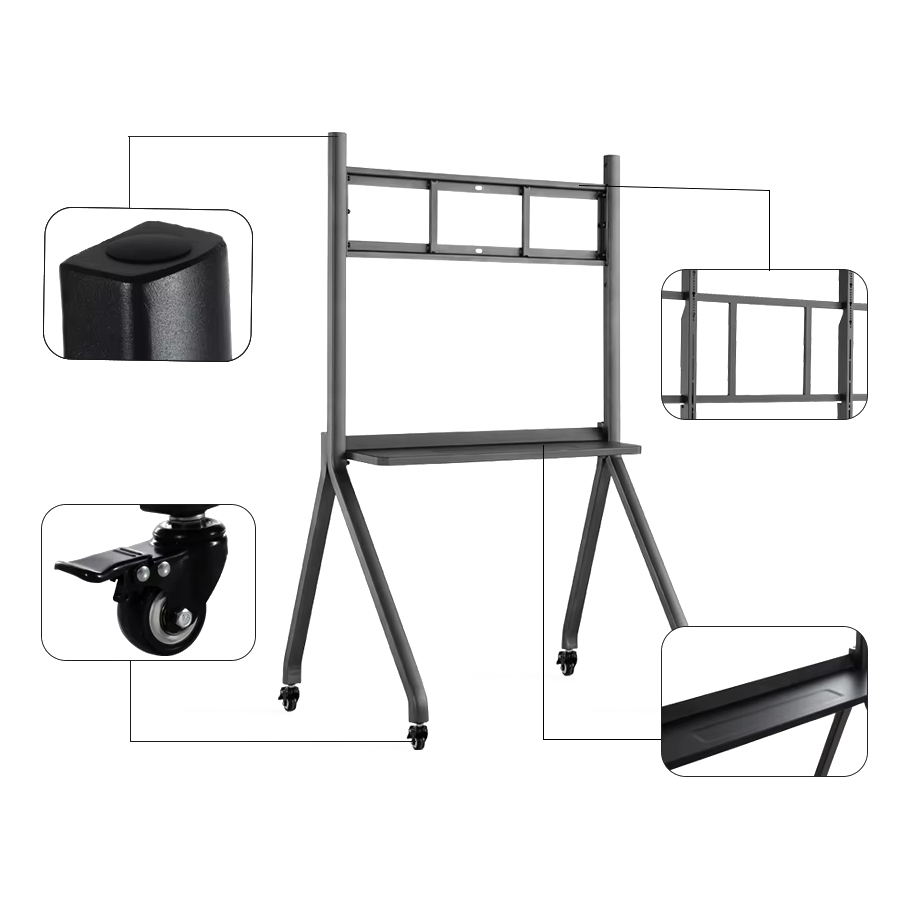 Преимущества конструкции заключаются в эргономичном дизайне, который позволяет легко перемещать тяжелые панели между помещениями. Стойка оснащена прочными и маневренными всенаправленными колесами, что делает конструкцию оптимальным инструментом для динамично развивающихся офисов и образовательных учреждений, нуждающихся в гибкой настройке оборудования.