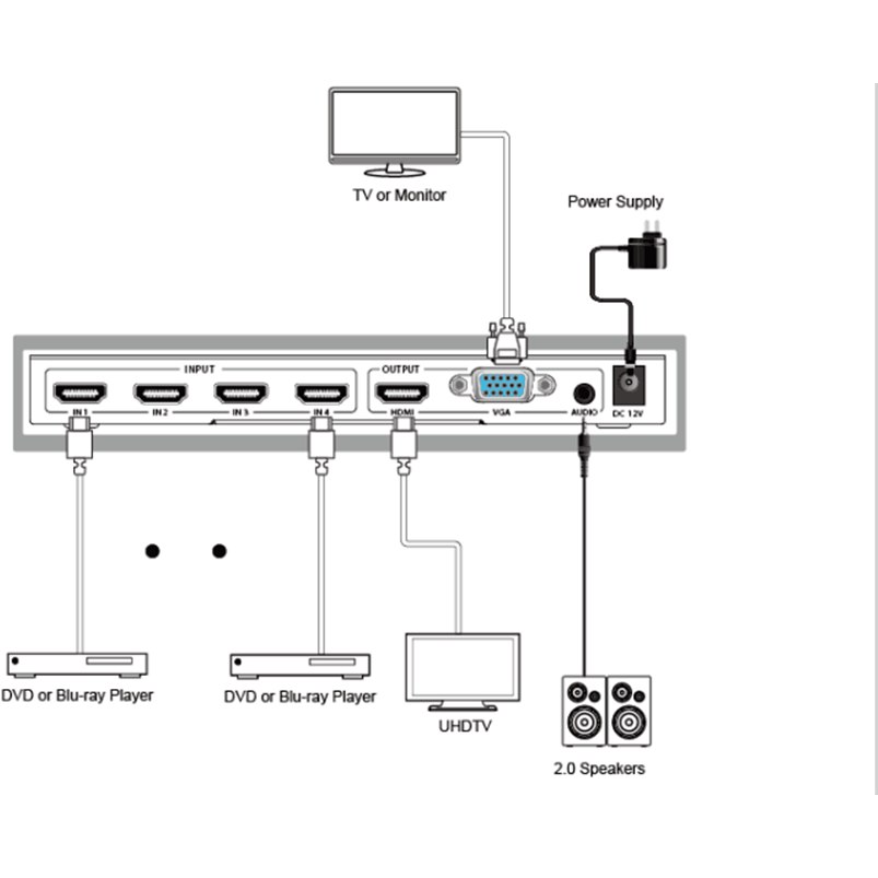 - 4 входа HDMI и 1 выход HDMI/VGA