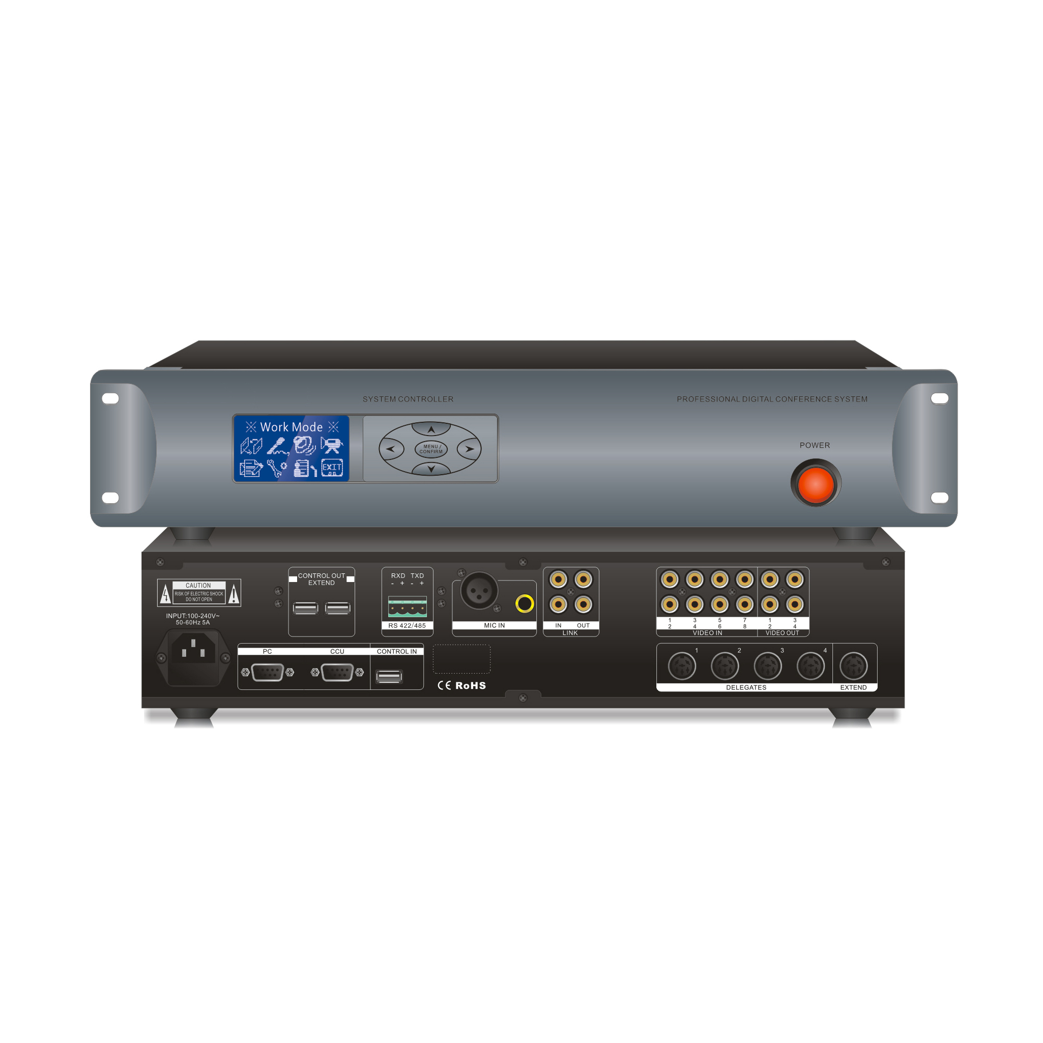 1. Всеми функциями конференц-зала можно управлять централизованно с помощью пятимерной навигационной клавиатуры на передней панели устройства для проведения конференций.