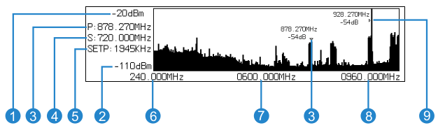 Удобство отображения параметров подчеркивается информативностью интерфейса, где курсор позволяет детально изучить состояние сигнала в конкретной точке частотного спектра. Пиковые значения максимума и минимума уровня, а также актуальные границы начальной и конечной частоты всегда доступны для анализа.