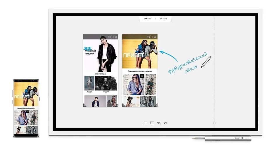 Благодаря возможности подключения к Samsung флип-чарту любого мобильного устройства, вы и ваша команда могут добавлять комментарии к любому контенту без ущерба для визуального качества изображения.