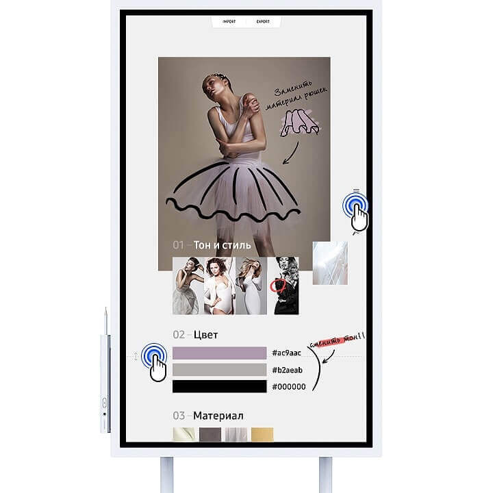 Интуитивная навигация Флип-чарта Samsung, дружественное меню сокращает время на управление или просмотр результатов творчества. Вы можете загрузить и просмотреть отдельно созданные ранее страницы и внести в них коррективы прямо на экране.