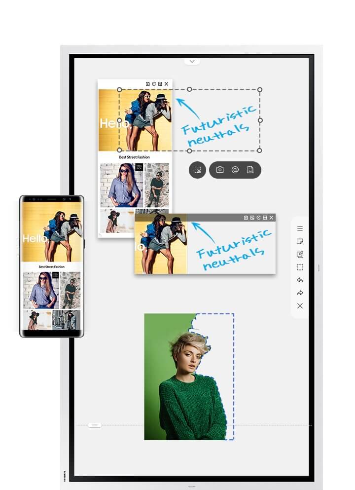 Многофункциональность использования. С помощью Samsung Flip пользователи могут быстро и легко выбрать, переместить, обрезать, "захватить" и отредактировать любое изображение. Кликнув по кнопке, каждое изображение может быть объединено с рабочим листом, после чего эти изображения можно редактировать или удалять.