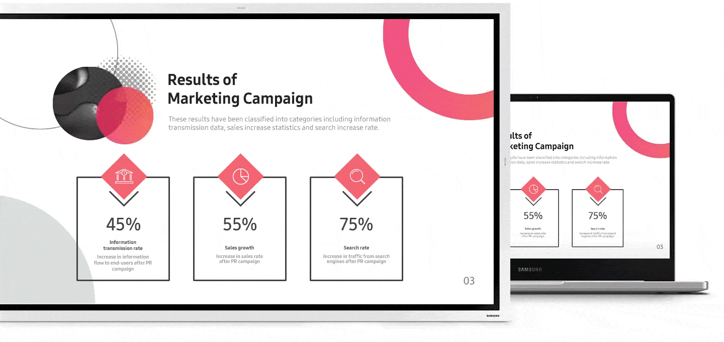 Пользователи могут спроецировать контент Samsung Flip на другой - больший экран в реальном времени с помощью сети Wi-Fi или подключения через HDMI порт. Экран флип-чарта можно отобразить на любом другом персональном устройстве. Эта функция – отличное решение для совещаний с большим числом участников.