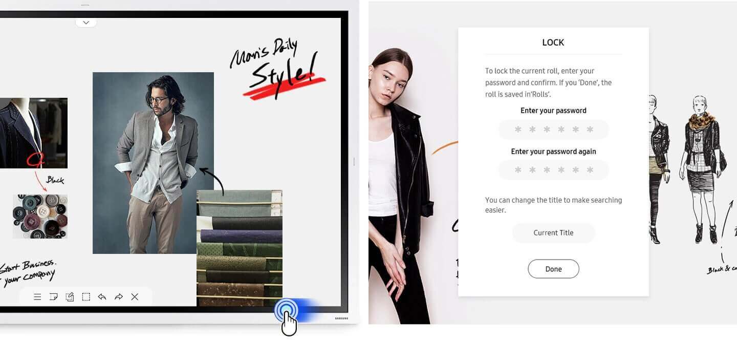 Samsung Flip имеет до 20 рабочих листов и вы можете перелистывать их когда это необходимо. Кроме того, флип-чарт оснащен системой защиты конфиденциальной информации о совещаниях, так что она никогда не попадет в чужие руки. Надежная система блокировки позволяет пользователям скрывать контент от посторонних.