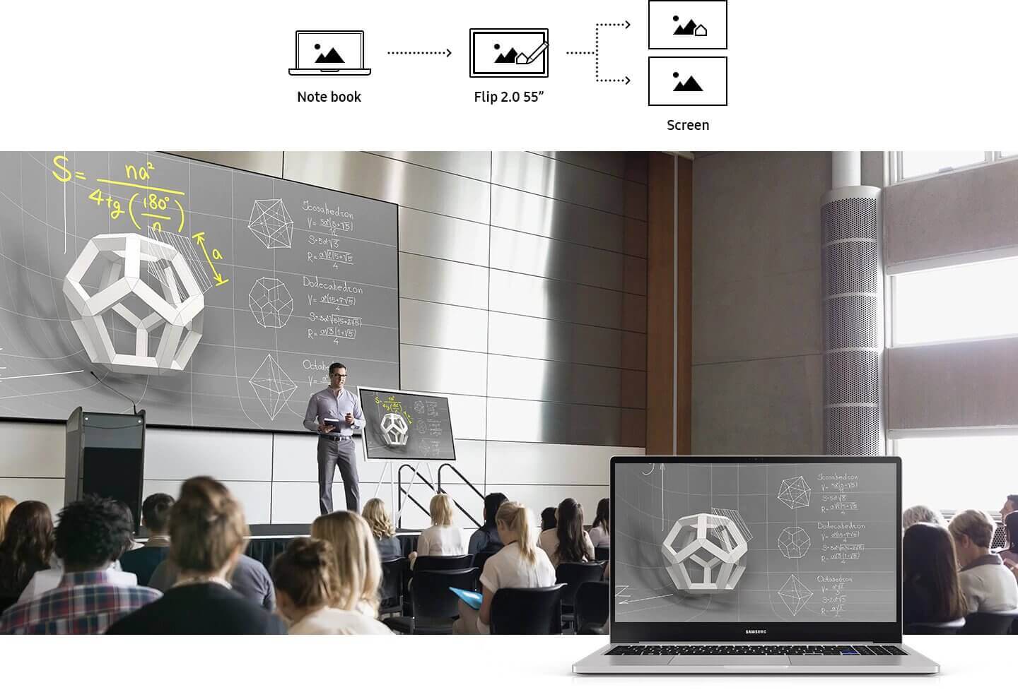 Пользователи могут спроецировать контент Samsung Flip на другой - больший экран в реальном времени с помощью сети Wi-Fi или подключения через HDMI порт. Экран флип-чарта можно отобразить на любом другом персональном устройстве. Эта функция – отличное решение для совещаний с большим числом участников.