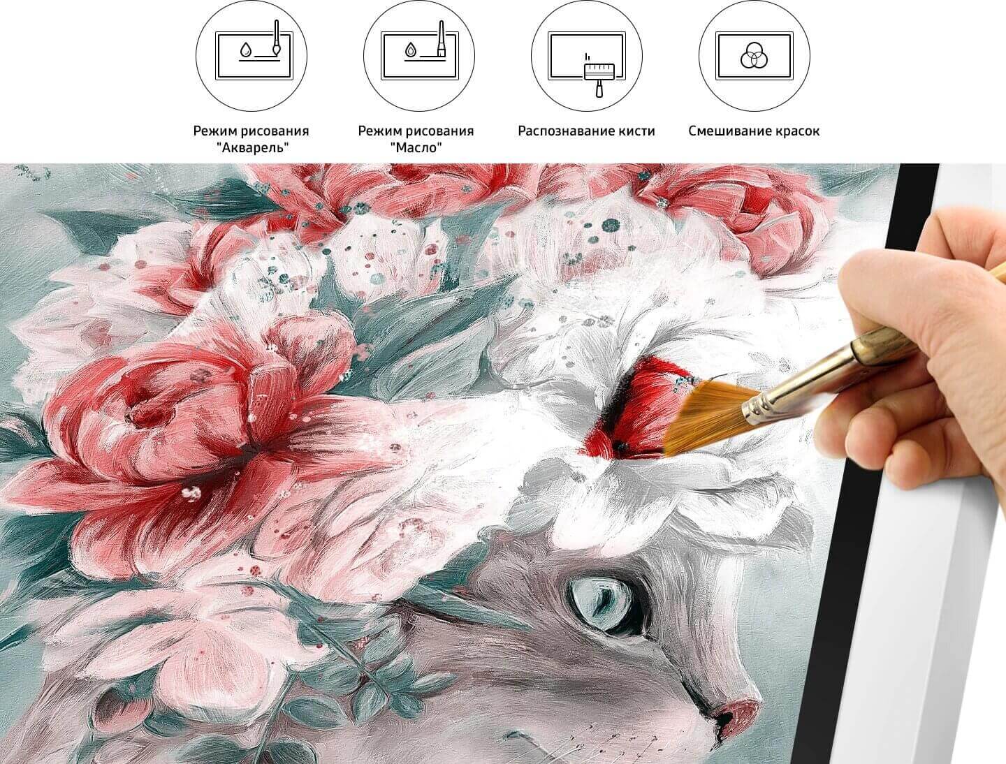 В режиме "Кисть" флип-чарт Samsung распознает широкий диапазон выбора толщины линии, благодаря чему пользователи могут рисовать с помощью мазков кистью. Режимы рисования "Акварель" и "Масло" позволяют выбирать различные стили и текстуры, при этом филип-чарт предоставляет в распоряжение пользователя богатую цветовую палитру и даже возможность смешивания красок.