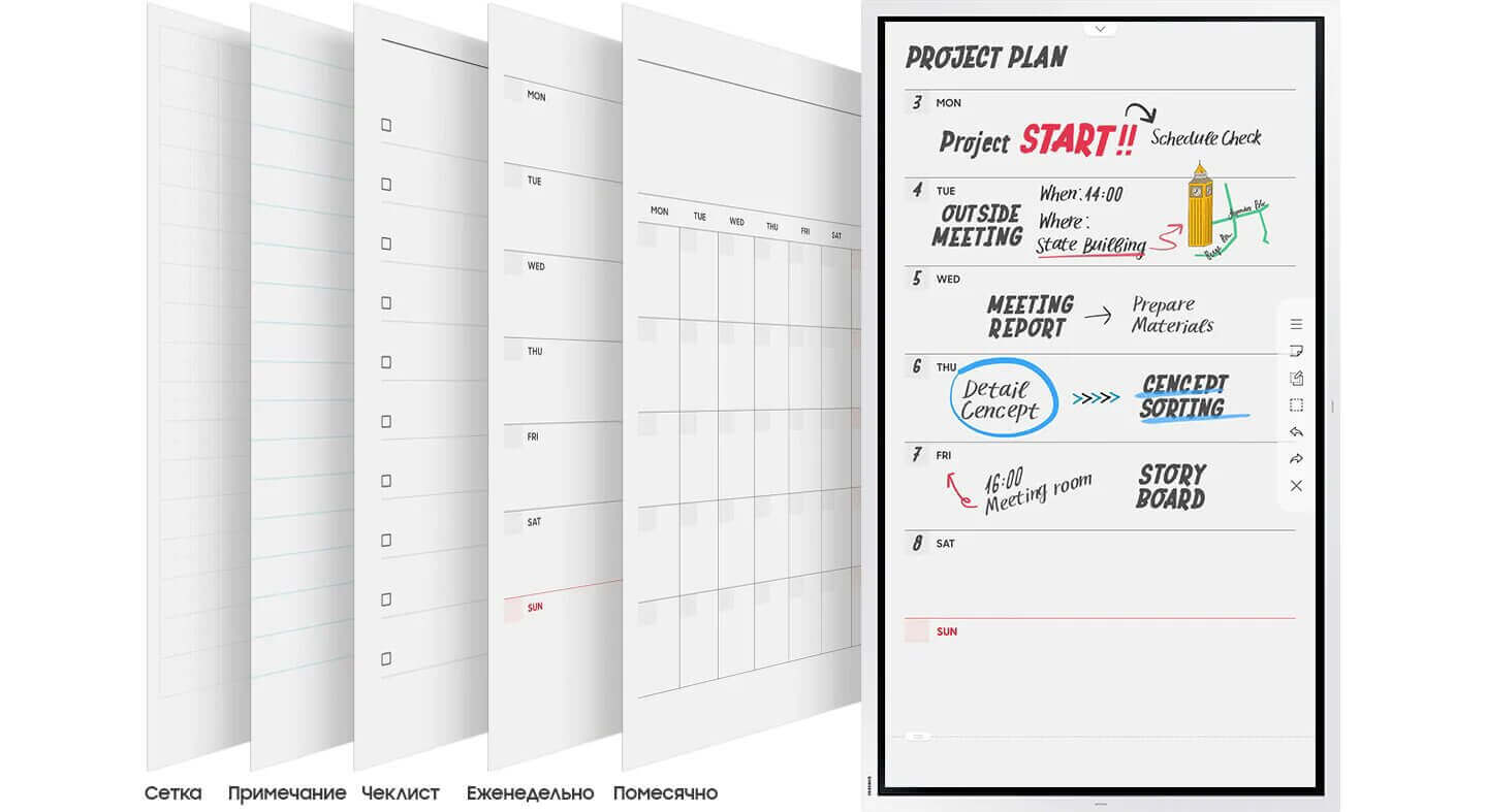 Вы можете использовать флип-чарт как календарь, расписание, блокнот для заметок или как планшет со списком дел. Samsung Flip идеально подойдет для любого бизнес-проекта, предоставляя возможность использовать экран для различных задач.