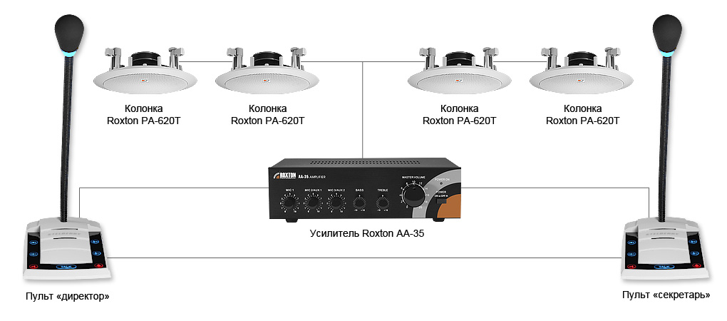 Для организации полноценной системы оповещения достаточно соединить выходы громкого оповещения пультов со входами AUX1 и AUX2 усилителя ROXTON AA-35. К усилителю могут быть подключены параллельно до 6 колонок ROXTON PA-620T. Удобная конструкция потолочных громкоговорителей позволяет с легкостью смонтировать их в подвесной потолок.