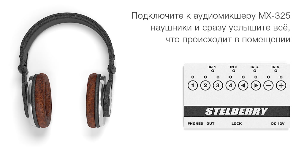 ля удобного контроля и настройки звука, аудиомикшер STELBERRY MX-325 оснащён выходом для наушников. Аудиомикшер STELBERRY MX-325 предназначен для смешивания сигналов с 4-х любых микрофонов для видеонаблюдения. Расположив микрофоны в разных частях помещения и подключив их к аудиомикшеру, можно отчётливо услышать все разговоры в комнате.
