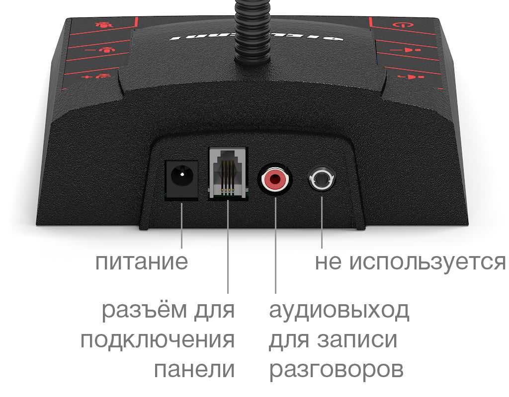 Пульт кассира оснащён разъёмом для подключения блока питания, разъёмом для подключения панели клиента и аудиовыходом для записи разговоров.