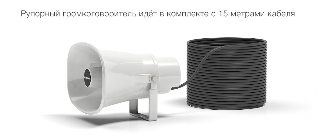 - рупорный громкоговоритель мощностью 15Вт с 15-ю метрами кабеля и ответной частью разъёма для подключения к пульту кассира;