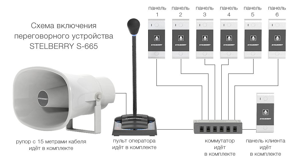 Переговорное устройство комплектуется рупорным громкоговорителем, к которому уже подключено 15 метров кабеля. Для подключения громкоговорителя к пульту кассира окончание кабеля завершается соответствующим разъёмом. Для длительной многолетней службы кабеля, необходимо защитить от разрушающего действия ультрафиолета гофрированной трубой ПВХ, стойкой к ультрафиолетовому излучению, те части кабеля, которые будут находиться на солнечном свету.