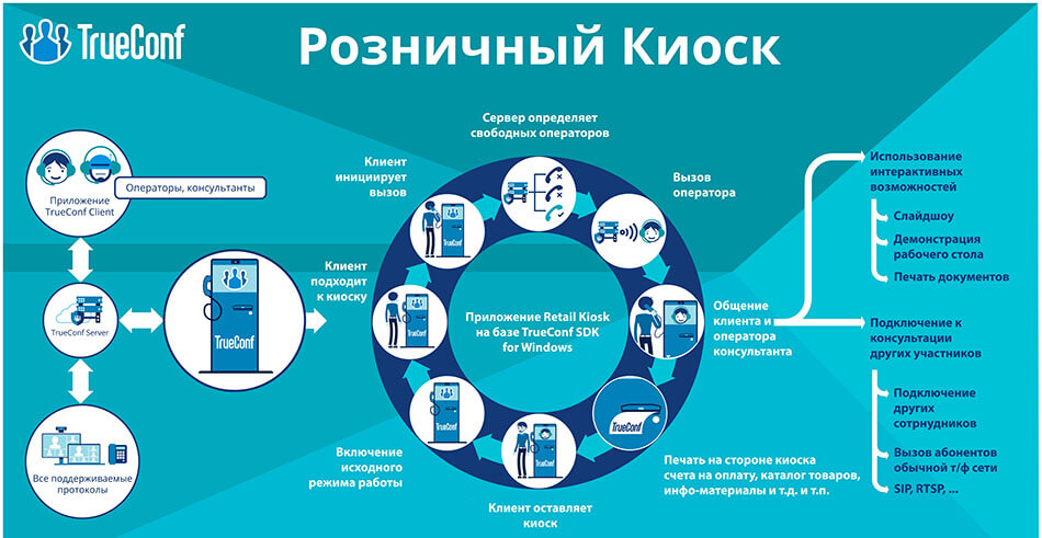 Широкий спектр различных API и библиотек SDK, которые позволят легко добавить поддержку видеосвязь как в существующие десктопные или мобильные приложения, так и в новые решения, например, видеокиоски. Руководство по настройке TrueConf Kiosk
