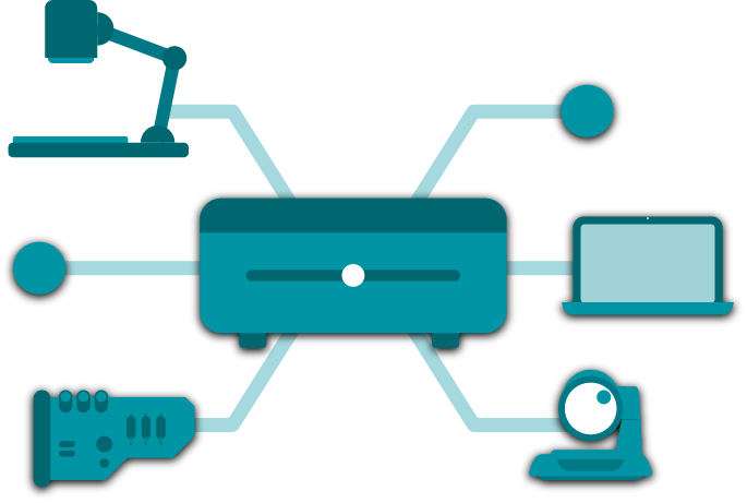 1. Возможность подключения ноутбуков или других HDMI устройств 2. Возможность подключения дополнительных зональных или документ-камер 3. Захват и передача контента из нескольких источников одновременно |