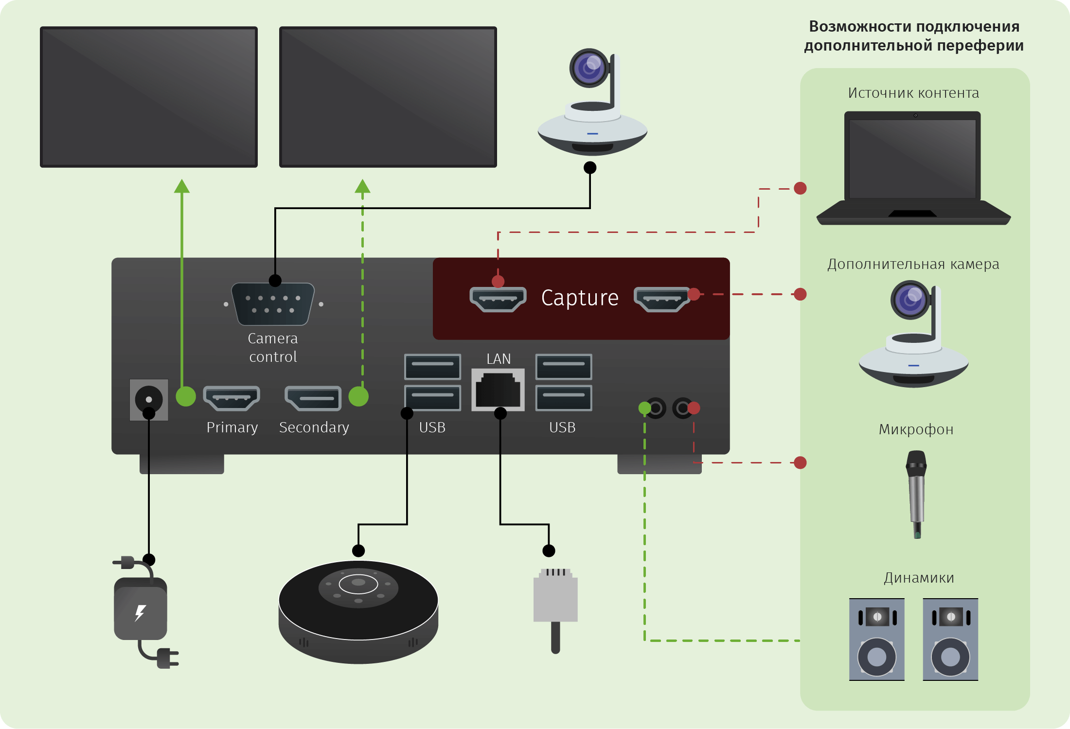 - Захват звука презентаций с HDMI-источников: звук воспроизводится локально и подмешивается к сигналу микрофона.